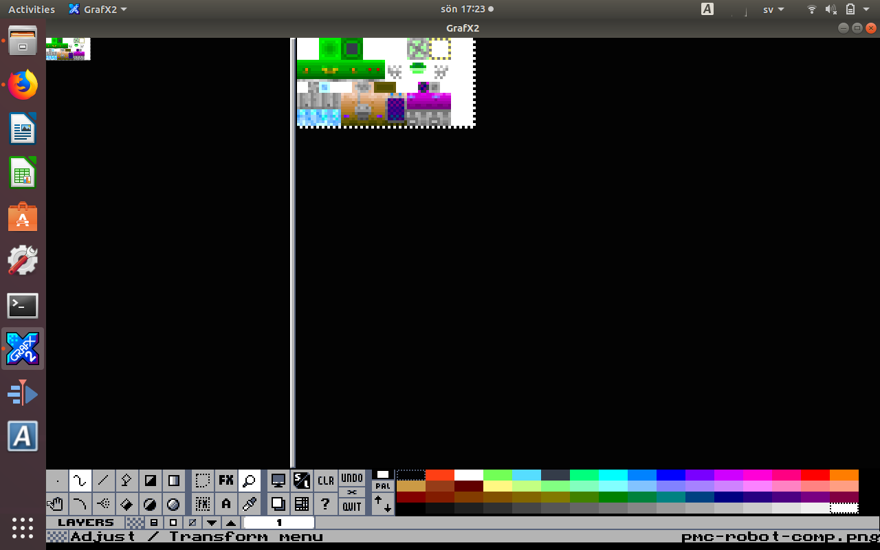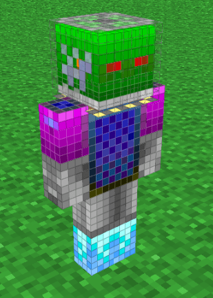 I divide the work roughly in the head, the body, the legs, the arms and the additional second layer around the head and spread this on the days I have available before the deadline, making sure I have one extra day to spare. This turns out great, and I succeed in finishing with a skin that I even can show and explain well enough to my mother who has never played Minecraft nor seen or heard about the flying fruit-picking robot before.