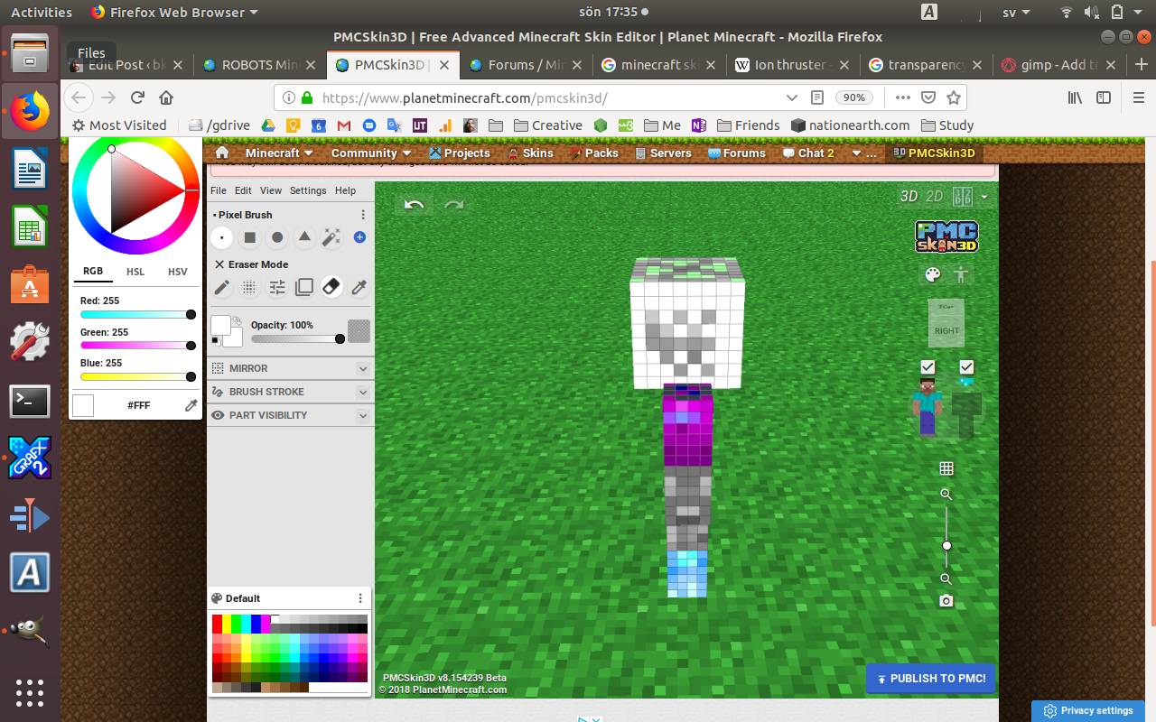 But I have an unsolved problem: Transparency! The second layer on the head parts are not transparent, the white will cover the head. Slight panic, until I finally cave in and use the tool recommended on the competition page, Planet Minecraft’s own skin editor: https://www.planetminecraft.com/pmcskin3d