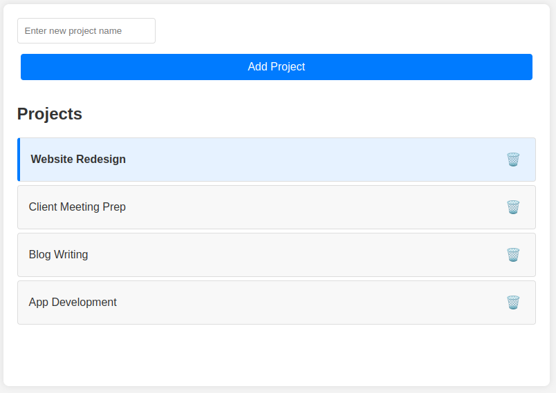 Interface for creating projects, tracking time with a start/stop timer, and manually adding time entries.