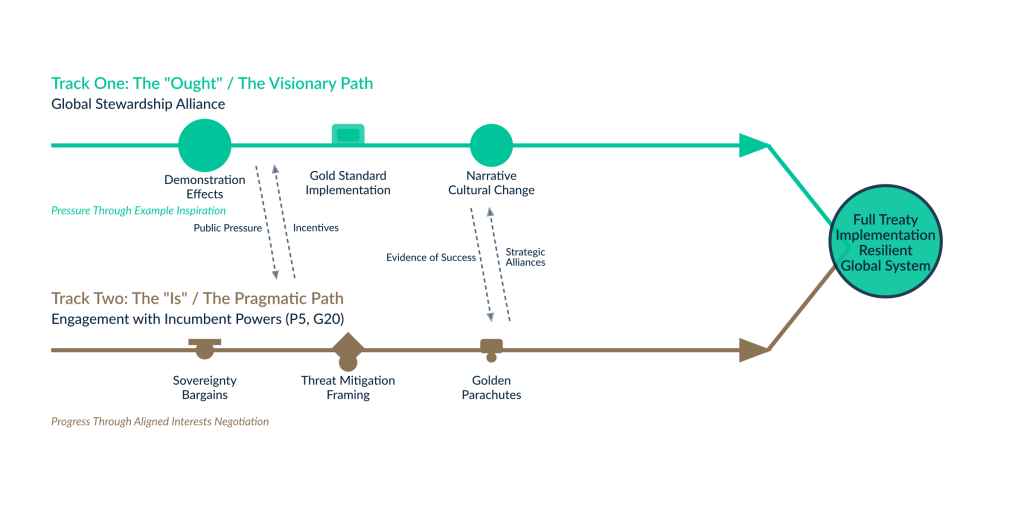 • The Visionary Path: A “Global Stewardship Alliance” of 30-50 willing nations, cities, and organizations will begin implementing Treaty mechanisms within their own jurisdictions and through new bilateral agreements. This acts as a real-world demonstration, creating irrefutable evidence that these reforms work.
