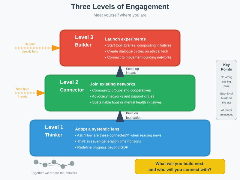Launch your own small-scale experiment—a tool library, a community composting initiative, a dialogue circle on ethical tech—and crucially, connect it to networks that are building the political power needed to protect and scale these new models against resistance from the old system, such as through alliances with activist groups or policy campaigns.
