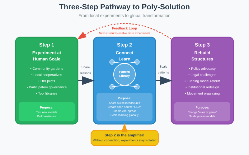 The good news? A “poly-solution” is possible—interconnected actions at every scale, starting small but scaling through learning. Building on your mindset “beta-test,” expand to collective experiments that incorporate high-leverage interventions and power-aware strategies.